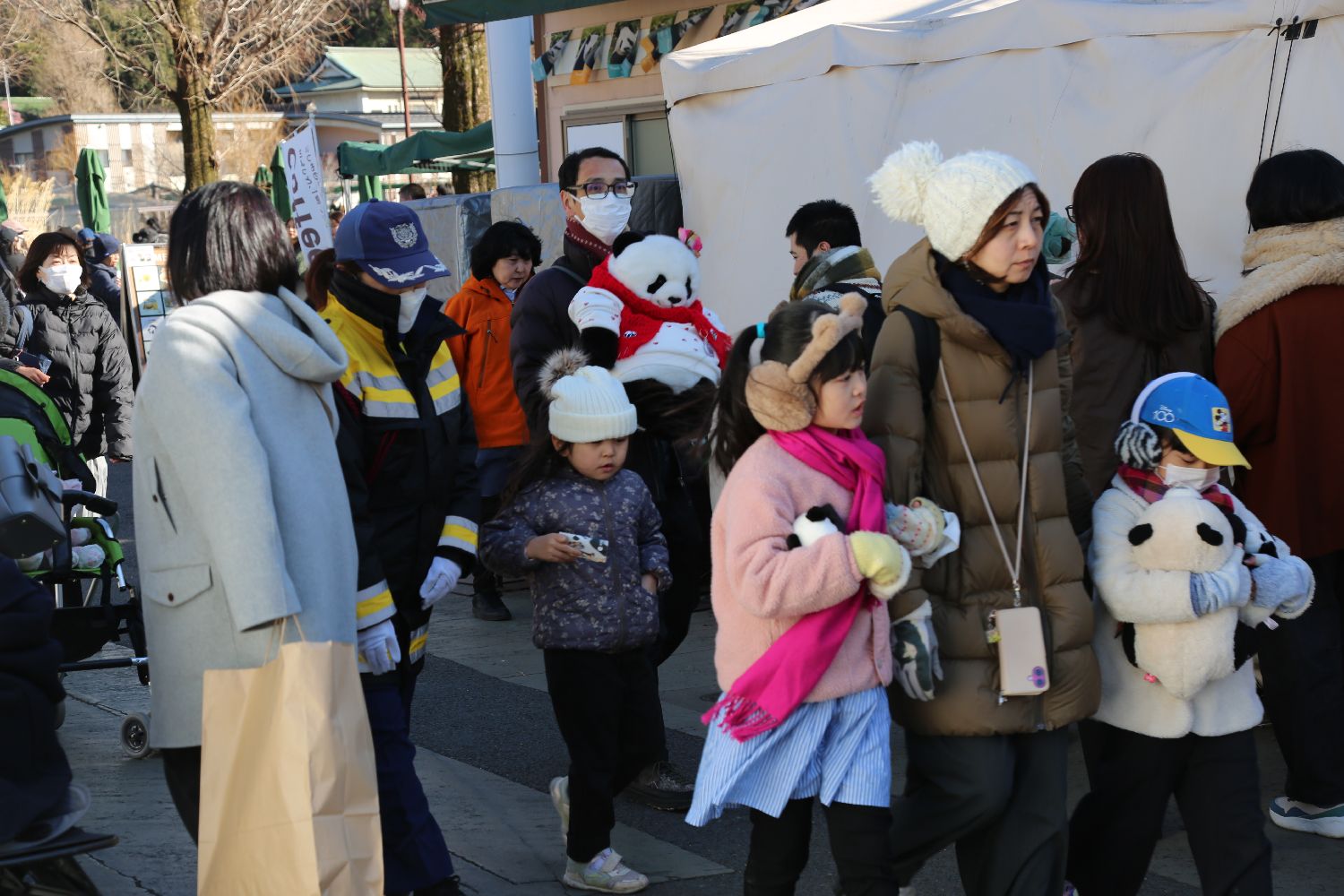 1月25日,旅日大熊猫“晓晓”和“蕾蕾”最后一天在日本东京上野动物园对公众开放参观。图为抱着熊猫玩偶的游客在上野动物园参观。(图/中新社)