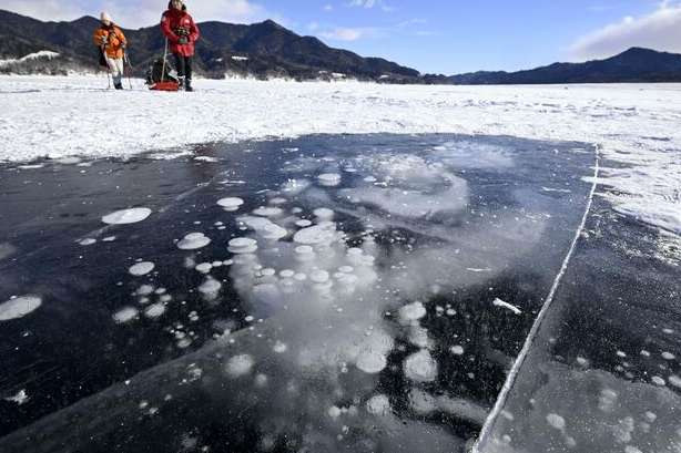 图为北海道糠平湖结冰湖面出现的“冰泡”。(图/共同社)
