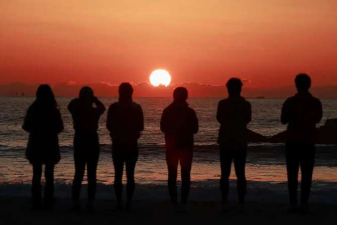 3月11日,在日本宫城县仙台的海边,人们在日出时分悼念2011年“3·11”东日本大地震和福岛核事故的遇难者。(图/新华社)