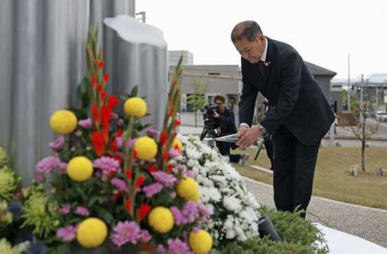 图为熊本县益城町町长西村博则在震灾纪念公园献花。(图/共同社)