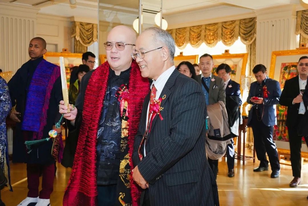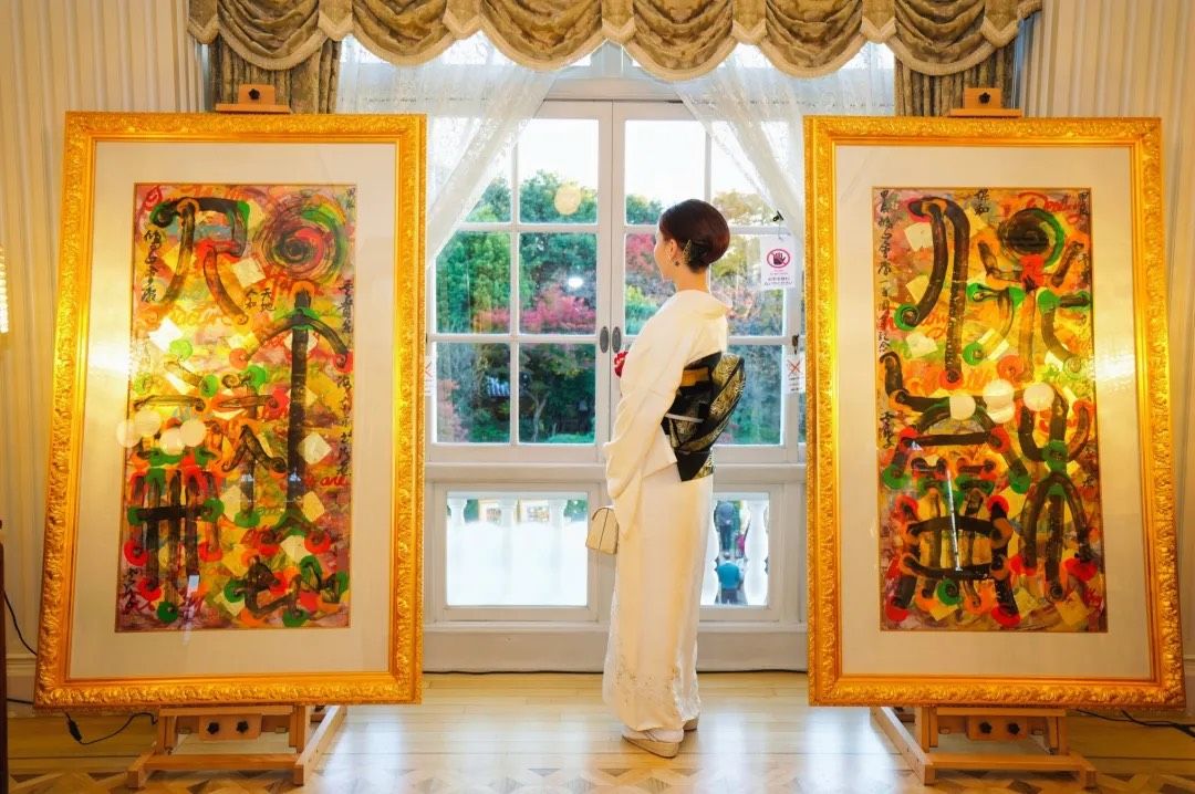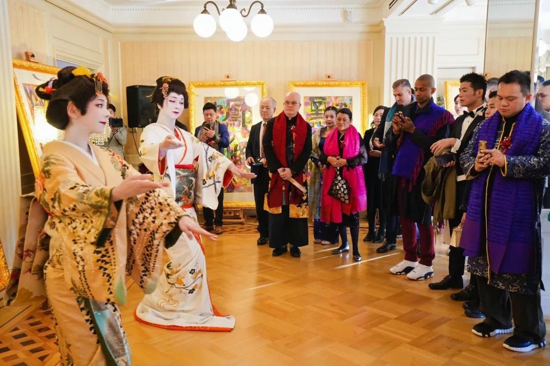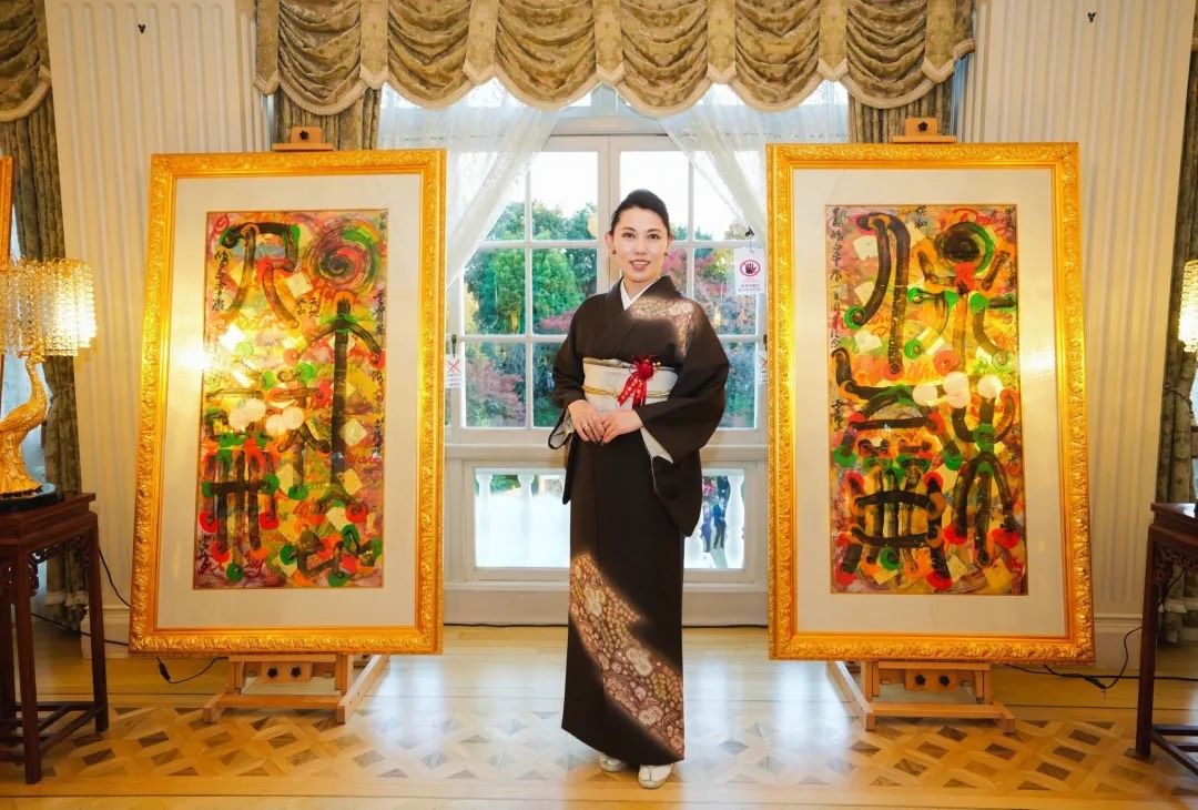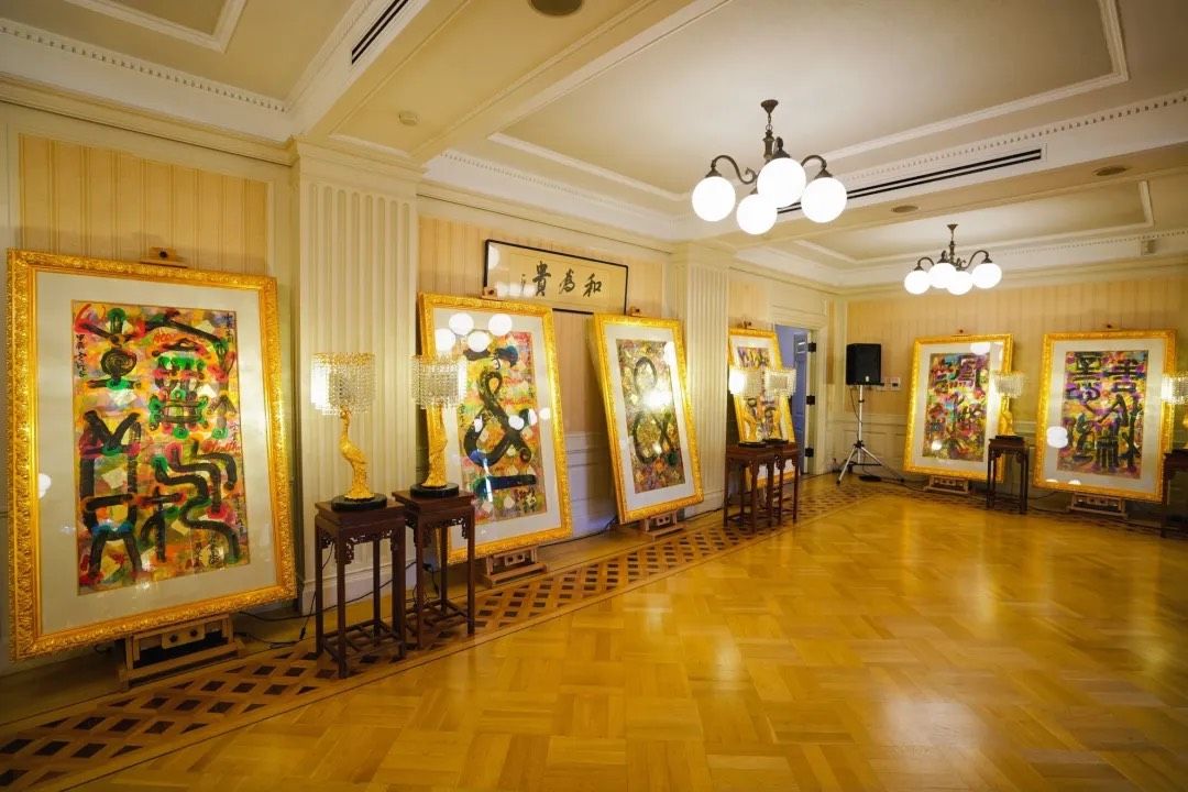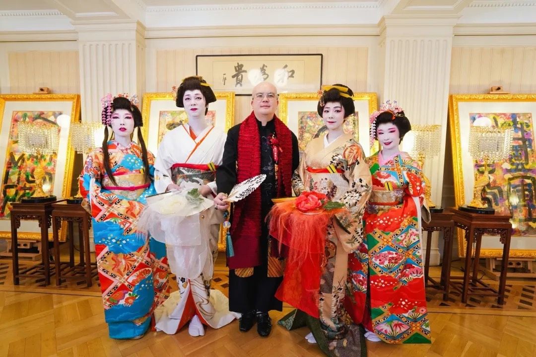 云龙子大师在开幕式上发表了以“和”为主题的致辞。他表示非常荣幸能够在鸠山会馆举办此次展览,并赞赏这座历史悠久的会馆风水卓越,象征着财富与贵气。云龙子大师强调,“和”是中日文化的核心理念,既展现了深厚的哲学智慧,又深入人们的日常生活。他围绕“和”创作了40幅作品,运用丰富的色彩和独特风格,将汉字、咒语及图案融合,传达了人与自然、人与人之间和谐相处的美好愿景。此次展览汇聚了来自中国、日本、新加坡、柬埔寨等地的贵宾,包括柬埔寨王子与公主、国际时尚设计师和名模等,共同分享并颂扬“和”的力量。云龙子大师相信,拥抱“和”的理念将带来和平、繁荣和幸福。