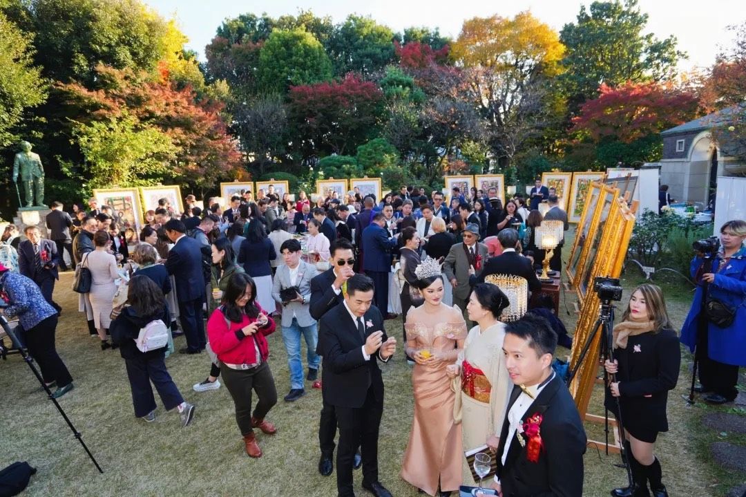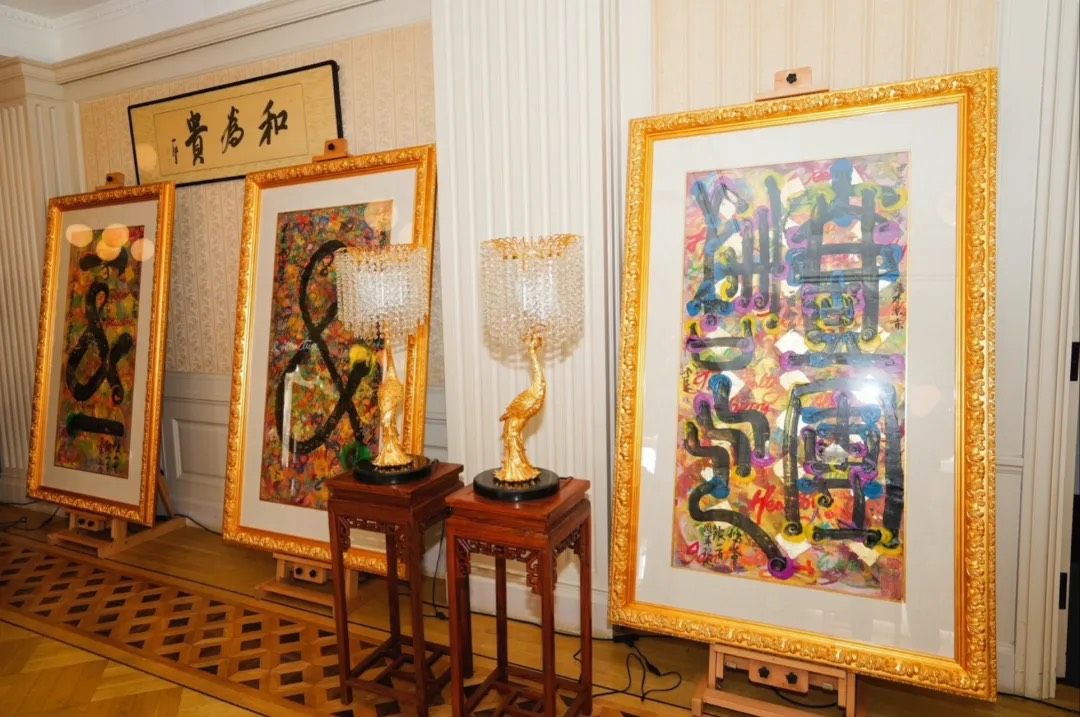 本次展览由艺术东京理事长常常策展,融合了书法与风水艺术,通过独特的艺术形式呈现了“和”的哲学概念。作品色彩丰富,形式多样,力求通过艺术表达人与人、人与自然之间的和谐与共生。展览现场吸引了来自各国的贵宾及艺术界人士,成为文化交流与艺术传播的重要平台。在开幕式上,钢琴家万象(老挝第一个室内音乐团体)与老挝演奏家和菲律宾歌手共同演唱了《我和你》。