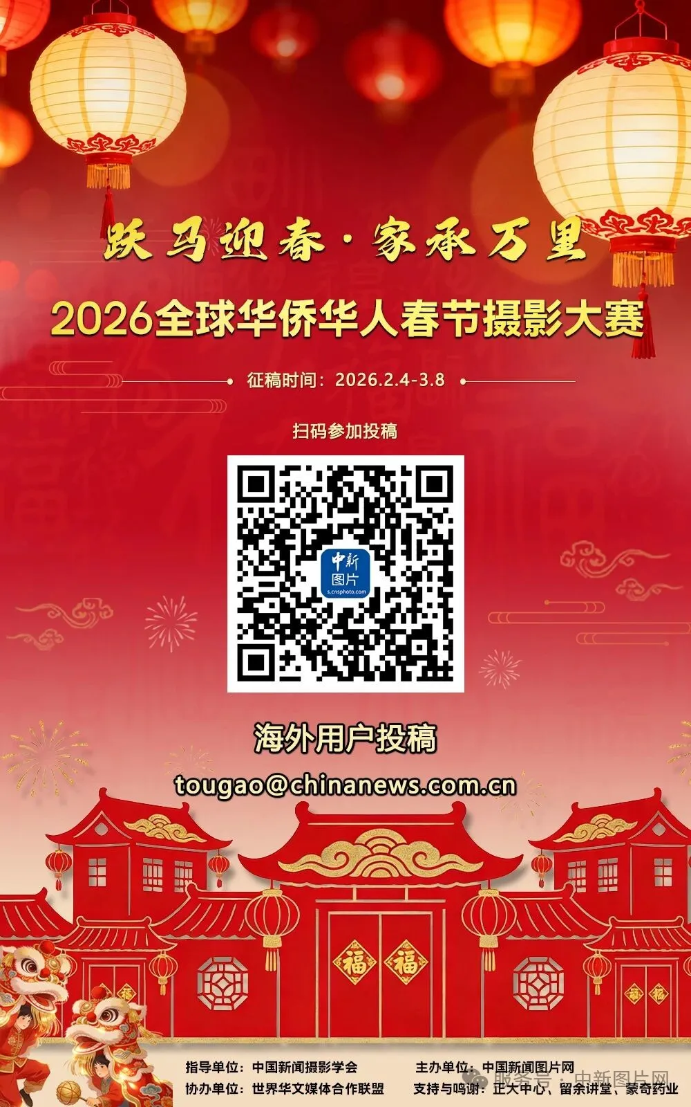 投稿人可通过电脑端或移动端登录中国新闻图片网征稿平台(https://zt.cnsphoto.com)进入“跃马迎春·家承万里——2026全球华侨华人春节摄影大赛”活动页面投稿;也可关注“中新图片网”微信号并点击“跃马迎春·家承万里——2026全球华侨华人春节摄影大赛”投稿入口进行投稿。