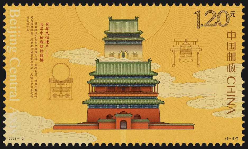 据中国邮政9日消息,2025年世界最佳邮票评选结果近日揭晓。中国邮政发行的《世界文化遗产——北京中轴线》特种邮票第5枚《钟鼓楼》摘得“2025年世界最佳邮票”桂冠和“最佳混合印刷邮票”类别第1名。