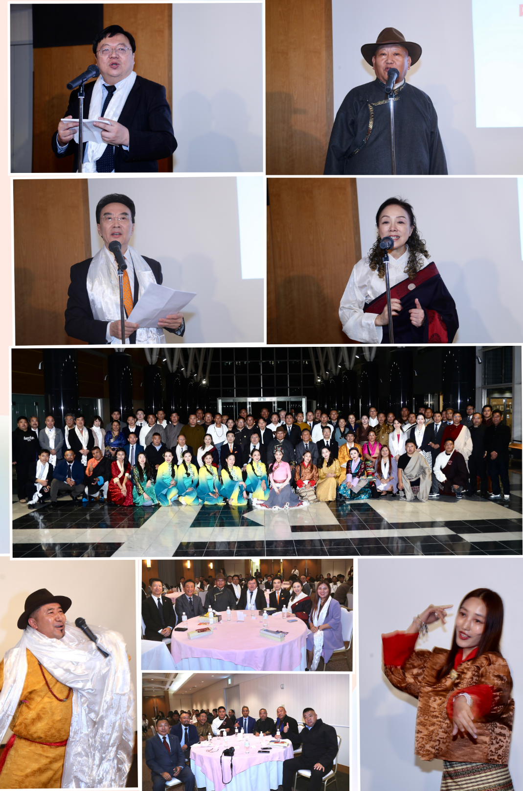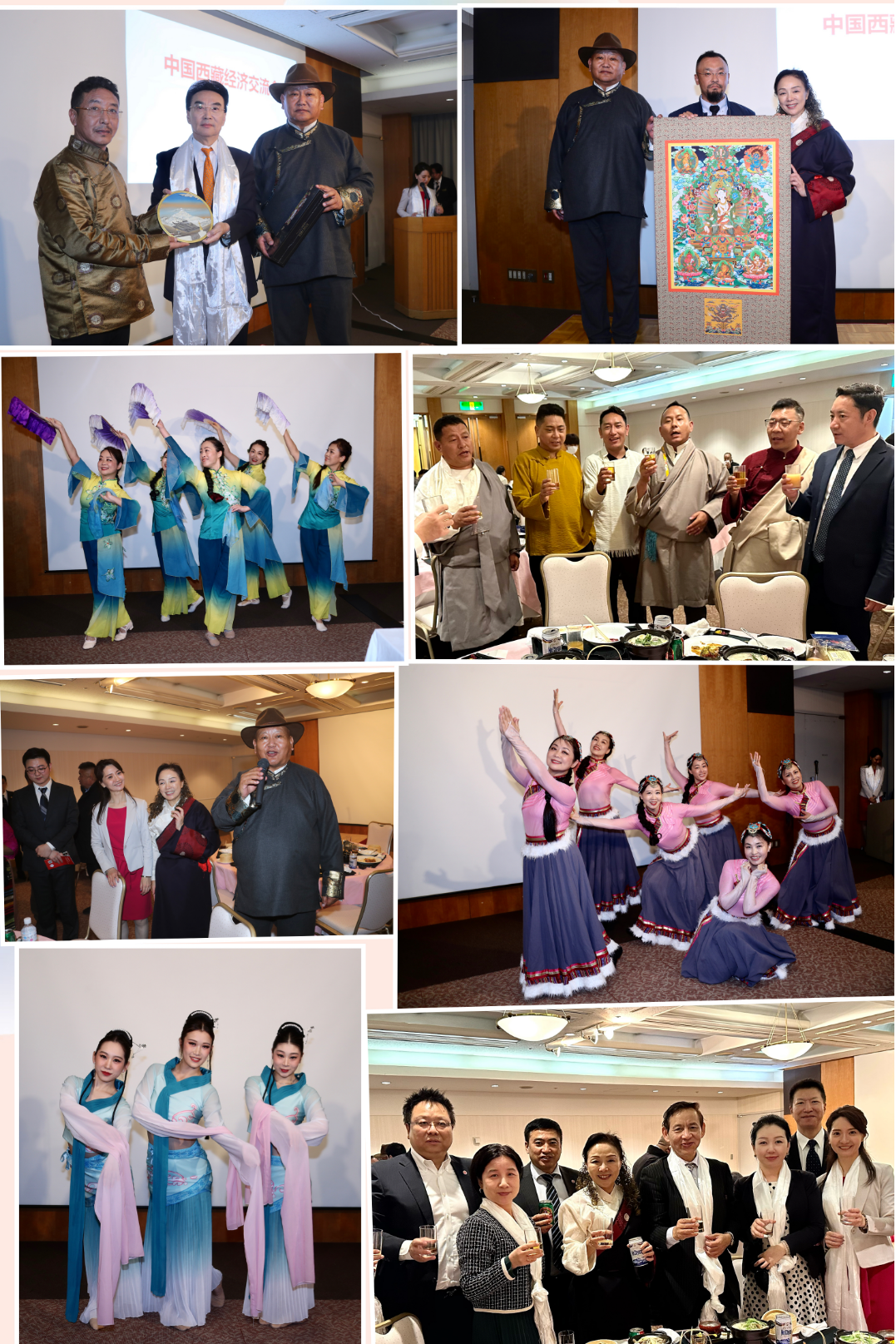 在交流会上,按照西藏的习俗,拉巴赤列会长为到场嘉宾戴上了洁白的哈达,各位代表向大家介绍了西藏丰饶的物产,藏香、冬虫夏草、唐卡等应有尽有,据介绍,还有牦牛的毛纺织品,又环保又温暖,是西藏独有的珍贵物产。日本接待方为代表团准备了藏族舞蹈,在亲切交流之时,西藏代表团成员也载歌载舞,展现了能歌善舞藏族人的热情质朴。