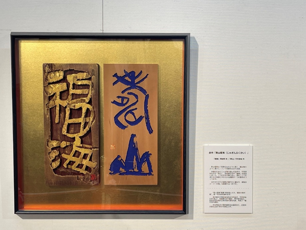刻字艺术的魅力,在于将毛笔的轻重缓急转化为雕刀的深浅起伏,或辅以彩漆,或用不同手法的打磨创造出不同的光影面貌。展厅内展出的竹市先生的作品多以佛教典籍为题材,辅以彩漆;何先生的作品则仅使用木材和汉字来表现,在对木材的刻画打磨中赋以作品不同的质感。两位艺术家在同一个艺术领域中的不同艺术表现,体现了本次中日两国刻字艺术的共同基础——来自同一个源头“汉字”,但又以不同形式表现出来,并让各自特色交相辉映,产生共鸣。