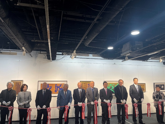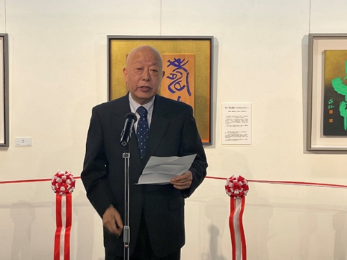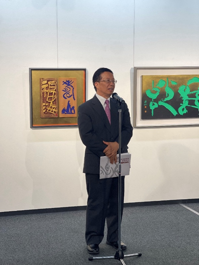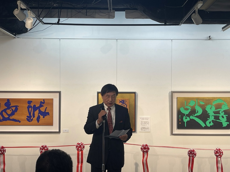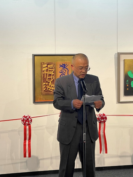 在举行了剪彩仪式后,由国际亚洲共同体学会副理事长、日本华人教授会创始会长 、东洋学园大学客座教授朱建荣致祝酒词。他说竹市先生提到了中日两国的刻字风格不同,他本人从中国的刻字艺术尤其是从何先生的作品当中受到不少启发。黄星原大使在致辞中也提过汉字起源于中国,而刻字技术是中日之间相互学习共同发展的结晶。所以本次联展就有了一个关键词:相互切磋与共鸣。