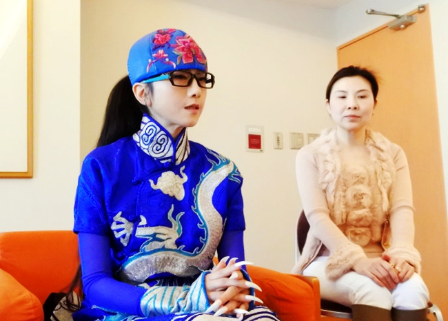杨丽萍接受媒体采访,右为太阳升集团董事长吕娟。