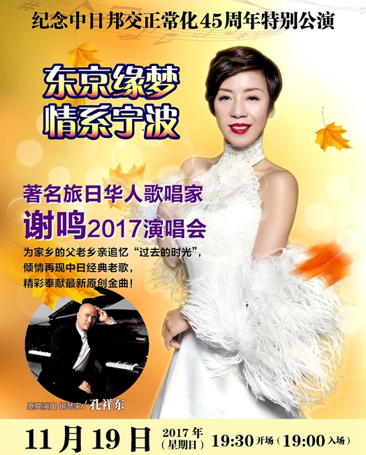 “作为旅日歌手,我会唱日语歌,以及自己原创的歌曲,今年8月,我刚刚在日本发行了最新专辑,其主打歌《西风里说再见》也会在宁波演唱。邓丽君有很著名歌曲,原唱都是日语歌,这次我也会用日文和中文唱邓丽君的歌,显示旅日歌手的特色。我还选了电影《泰坦尼克号》主题曲《我心永恒》 ,除了老歌及我的原创歌曲外,我也挑战“好声音”中的那些新生代歌曲……”谢鸣非常高兴地向记者一一介绍。