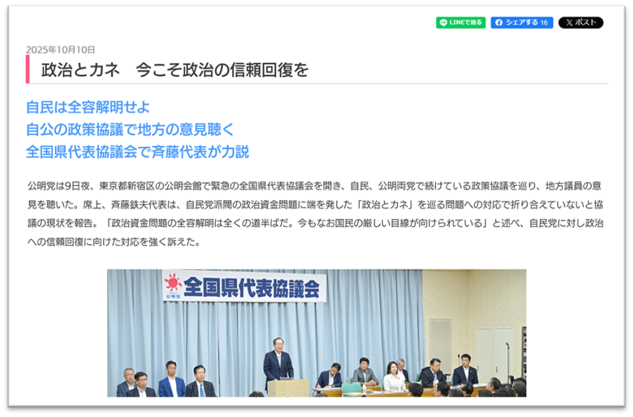 首先还是政治资金问题。齐藤对《朝日新闻》解释说:石破茂政权时期,自民党、公明党和立宪民主党三方曾开展正式会谈,当时石破首相对打击自民党内腐败问题展露出“非常积极的姿态”。公明党方面认为,若石破政权延续,相关议题将有机会得到“前所未有的推进”。