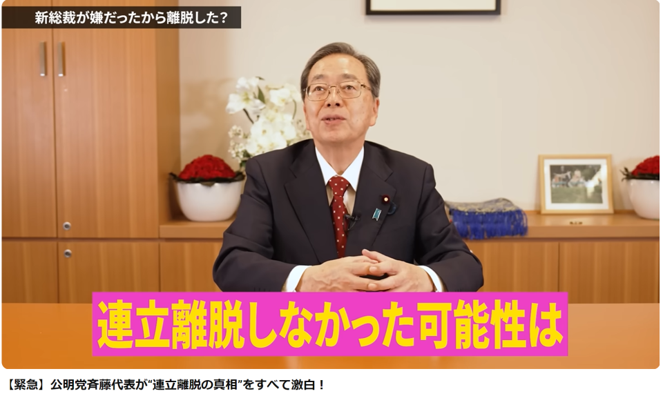 10月14日,公明党党首齐藤铁夫在《朝日新闻》的一则专访中表示:如果还是石破茂执政,我们大概就不会退出。