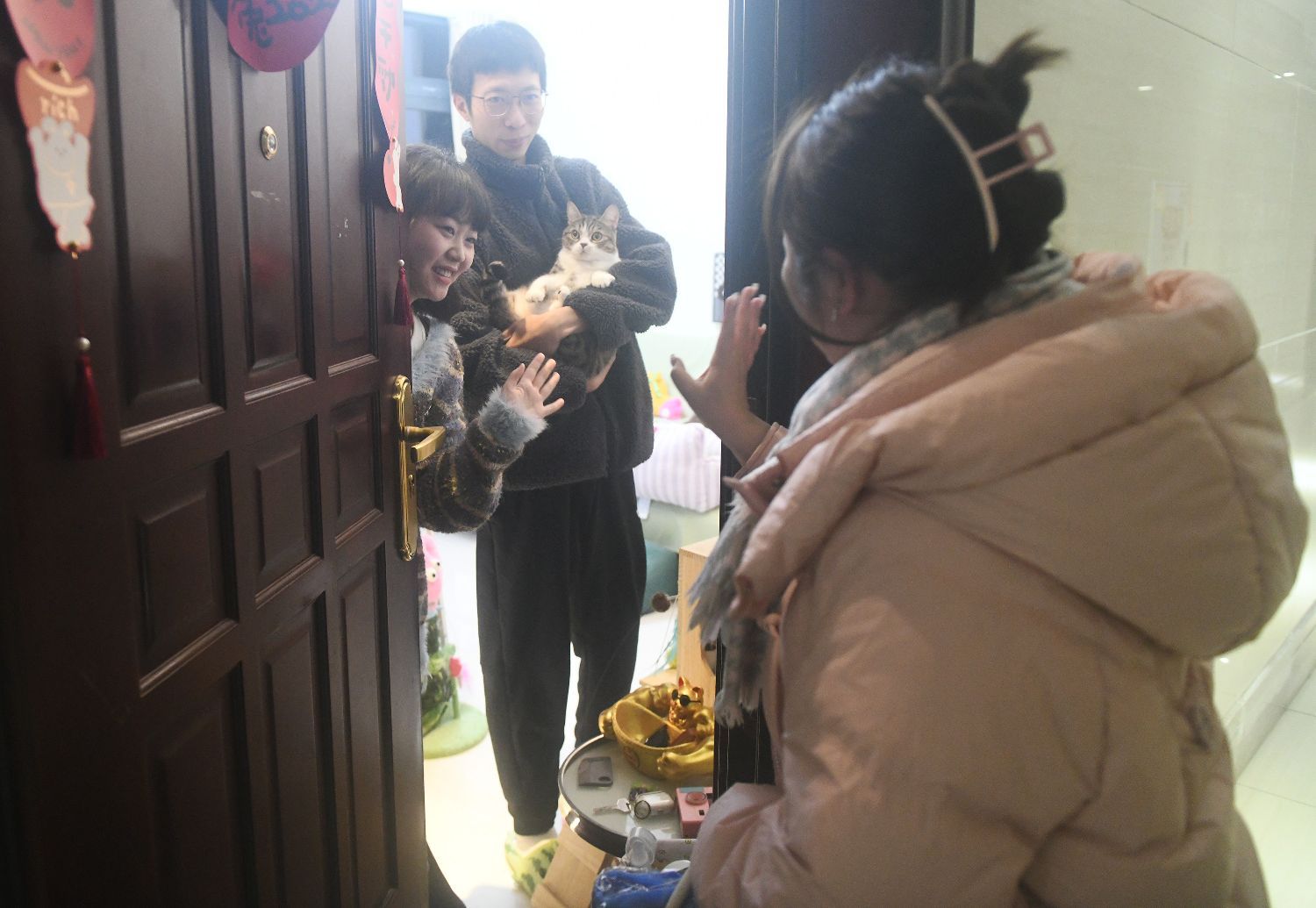 春節前の2月3日の夜、注文を受け、ペットの性格、餌の方法、使用量などの相談のために、事前に重慶市両江新区のペットの飼い主の家庭を訪れるペットシッターの甘適夢さん(右)(2024年2月3日撮影、資料写真)。(c)CNS/周毅
