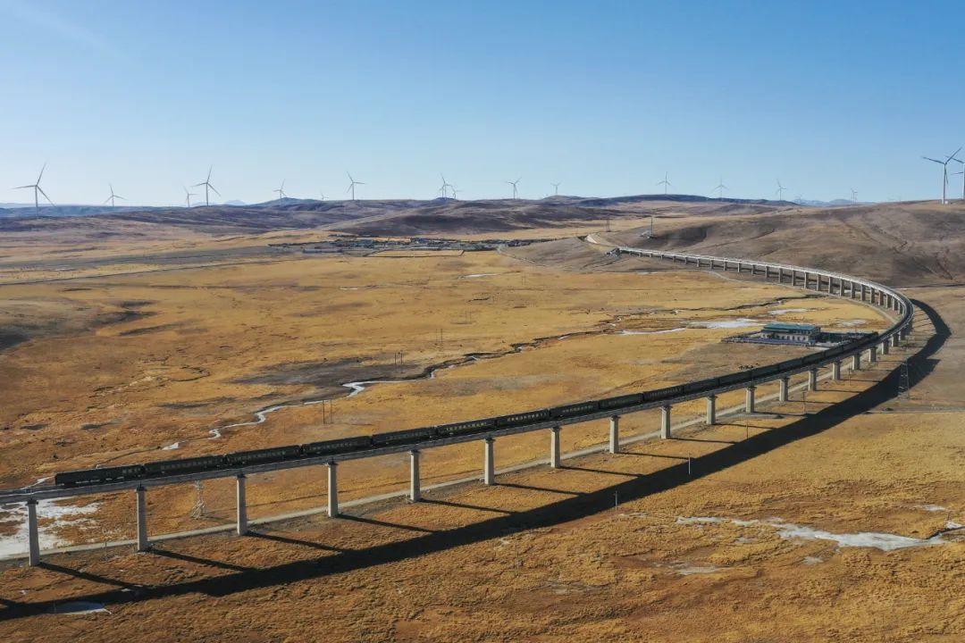 チベット自治区ナクチュ市色尼区にあるチベット自治区初の風力発電所を走行する青蔵鉄道の列車(2024年12月13日撮影、資料写真)。(c)CNS/コンガライショウ