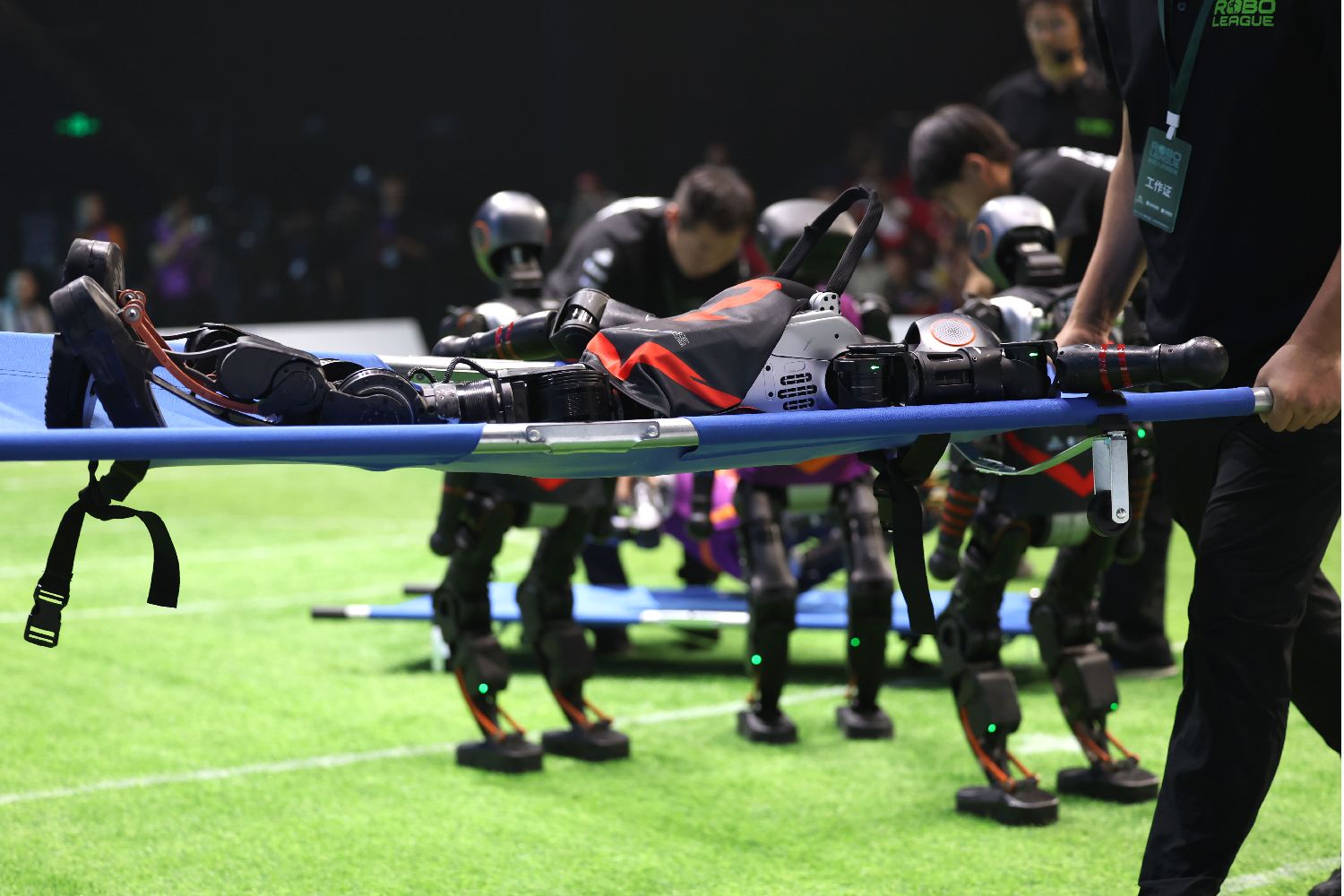 倒れたロボットがスタッフによってピッチから運び出される様子(2025年6月28日撮影、資料写真)。(c)CNS/富田