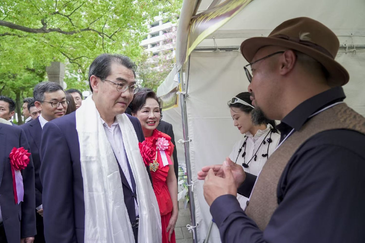 チャイナフェス九州のチベットブースを訪れ、チベット代表団と交流する呉江浩大使=2025年9月20日撮影(c)東方新報