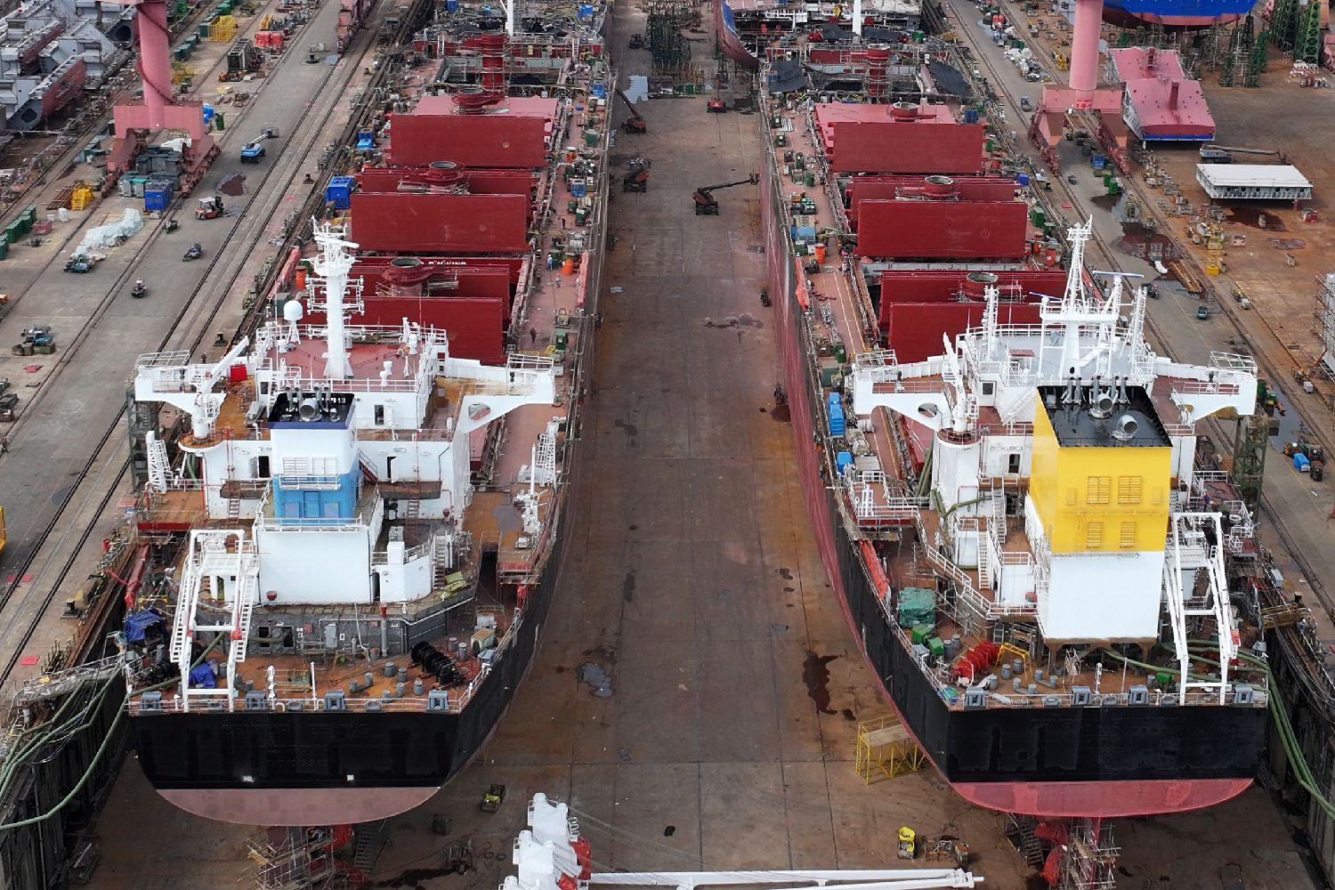 中国・江蘇省南通の造船企業で建造中の船舶=2024年10月10日撮影・資料写真(c)CNS/泱波
