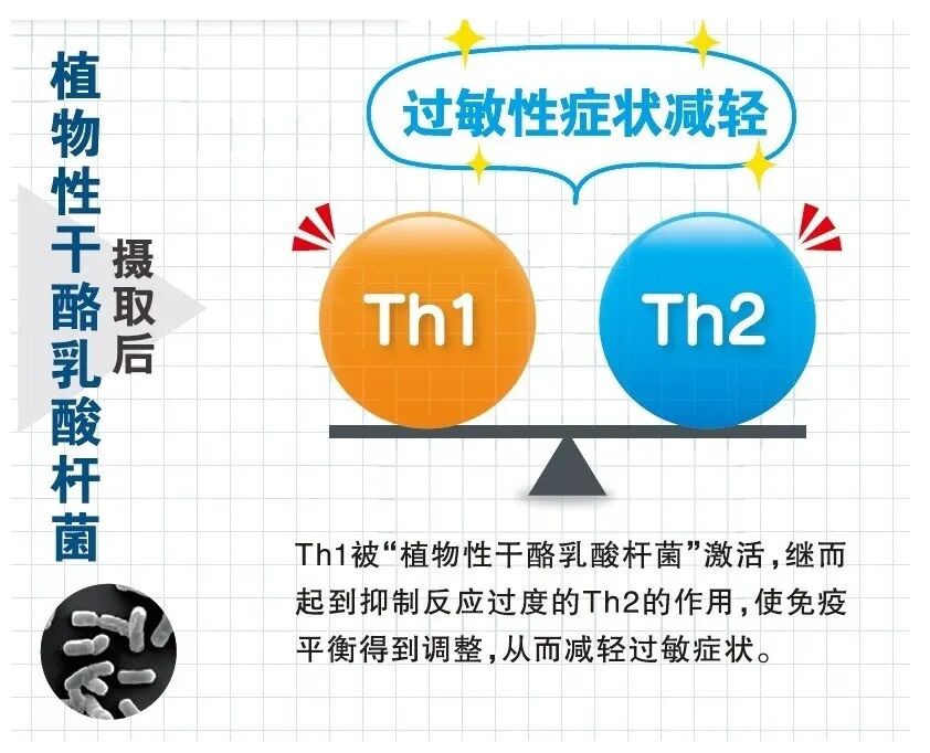 也就是说,通过摄取乳酸菌,有助于使弱化的Th1细胞的活性增强,同时抑制Th2细胞活性,起到促使两者恢复正常平衡状态的作用。