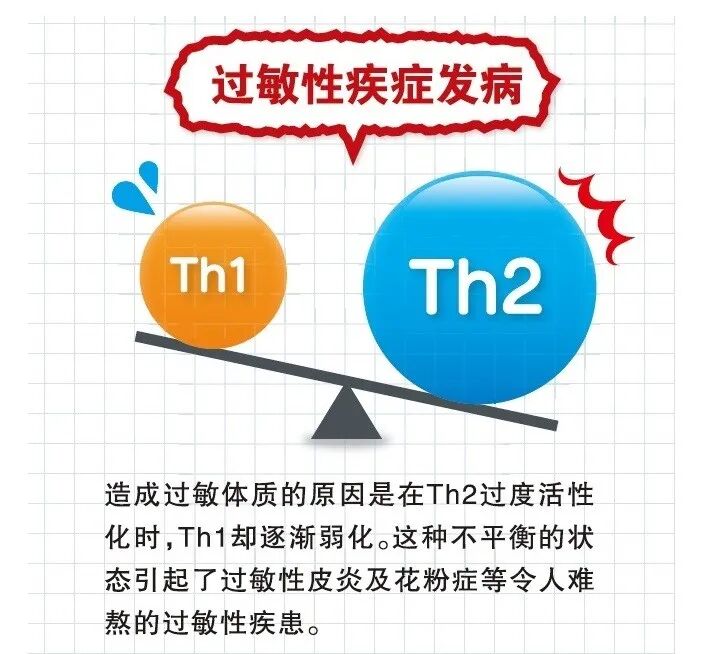当免疫平衡遭到破坏、Th2细胞占强势地位时,就会出现过敏性症状。