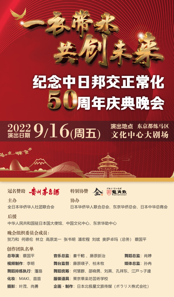 为纪念中日邦交正常化50周年,由全日本华侨华人社团联合会主办,中华人民共和国驻日本国大使馆等后援,由贵州茅台酒冠名赞助的“一衣带水 共创未来”纪念中日邦交正常化50周年庆典晚会将于2022年9月16日于东京练马区文化中心大剧场举行。