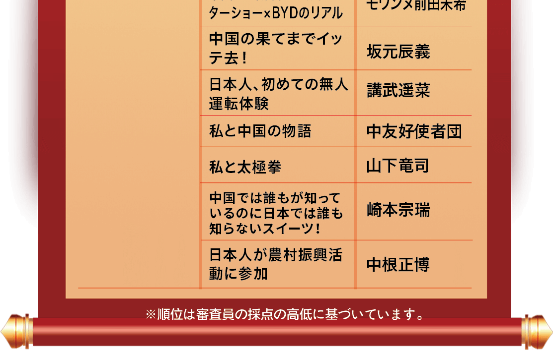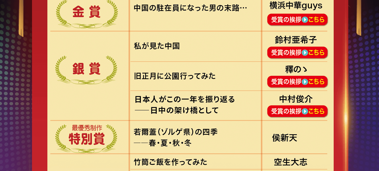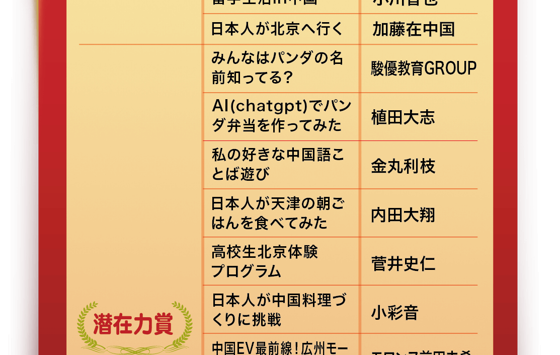 1. 「現代中国の発見」都市や農村、テクノロジー、ファッションなど、いまの中国の「おもしろさ」や「新しさ」が伝わる動画(例:#財布なしで1日過ごしてみた、#農村の市場ってどんなところ?、#おしゃれでつい欲しくなる中国の「名物」など)